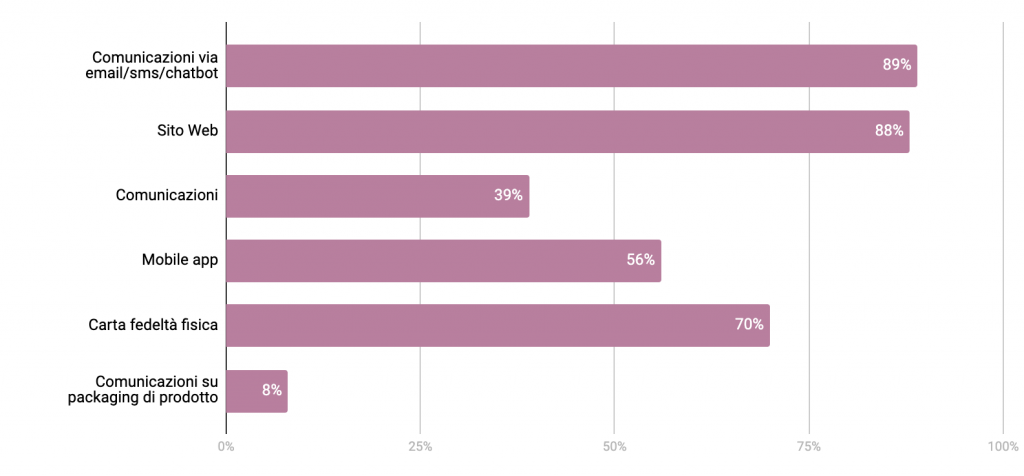 Iniziamo col dire che il 60% delle aziende B2C ha un programma fedeltà all’attivo e la comunicazione con i clienti fidelizzati viene gestita per la maggior parte attraverso email/sms/chatbot: